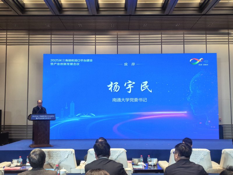 杨宇民代表学校致辞。他表示,南通大学始终以国家战略和地方需求为导向,在脑机接口领域持续深耕:今年 7 月,我校附属医院完成南通市首例、江苏省第二例脑机接口手术,实现区域技术应用零的突破;8 月,“脑机接口与神经调控研究型病房”揭牌启用,标志着我校附属医院神经疾病治疗在全省率先迈入“脑机融合”新阶段。未来我校将积极对接“国家高性能医疗器械创新中心”战略合作布局,主动参与“江苏脑机接口研究院南通分院”共建共享,全力融入“长三角介入脑机接口科创联合体”协同发展。